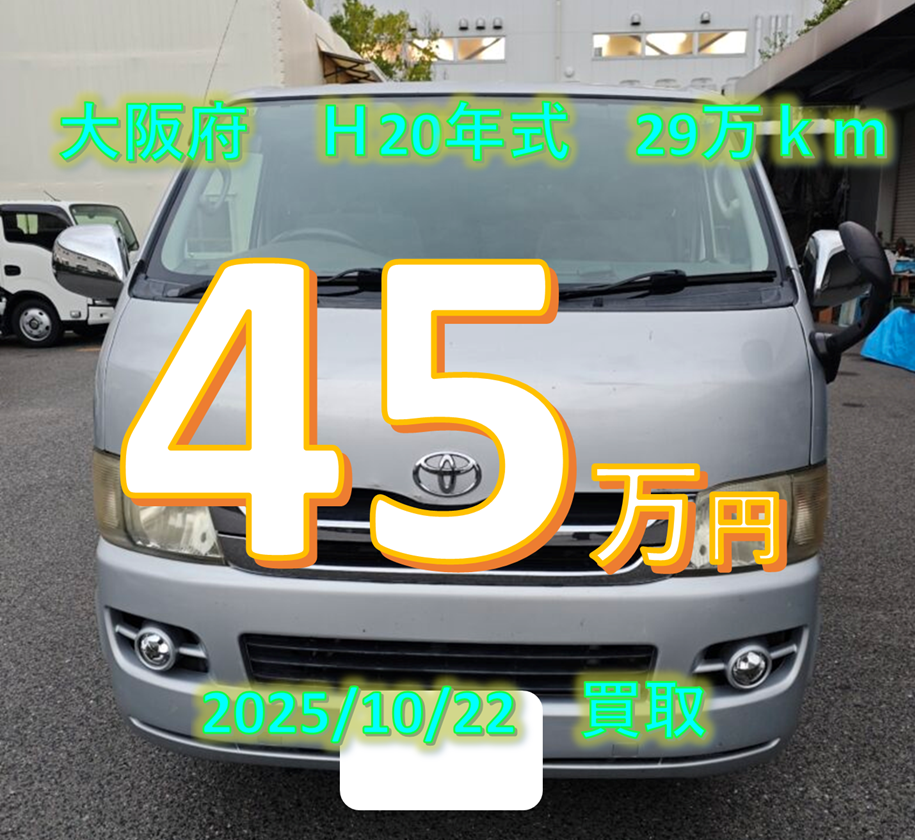 【買取事例】平成20年式ADF-KDH201V大阪府 2025年11月27日 ツイート シェア はてブ 送る Pocket 車名 ハイエースバン 年式 平成20年08月 走行距離 km 型式 ADF-KDH201V グレード スーパーGL 都道府県 大阪府 買取価格 450000円 類似のハイエース買取事例 ハイエースの概算査定金額をお知りになりたい場合はこちらから お名前 (必須) 地域 (必須) 例:大阪府 吹田市 メールアドレス (必須) 車種名 (必須) 選択してください —以下から選択してください—ハイエースバンレジアスエースバンハイエースワゴンレジアス(or ハイエースレジアス)その他 グレード(バンの場合) (必須)選択してください グレード(バンの場合) (必須)選択してください —以下から選択してください—スーパーGLDXーGLパッケージDX グレード(ワゴンの場合) (必須)選択してください —以下から選択してください—グランドキャビンGLDXリビングサルーンEXスーパーカスタムリミテッドスーパーカスタム(G)カスタムその他不明 型式がわかりますか? (必須) 選択してください —以下から選択してください—分かる今は分からない 型式(必須) 燃料の種類(必須) —以下から選択してください—ガソリンディーゼル 駆動方式(必須) —以下から選択してください—2WD4WD 年式(初年度登録)(必須) 例:H8年 走行距離 (必須) 例:約19万km 車検期限 (必須) 例:H28年9月 トランスミッション(必須) 選択してください —以下から選択してください—オートママニュアル スライドドアについて(必須) —以下から選択してください—わからない両側スライドドア(5ドア)片側スライドドア(4ドア) 荷室のタイヤハウスについて(必須) —以下から選択してください—わからないタイヤハウス有タイヤハウス無し(ジャストロー) 車体色 (必須) 例:白 車の状態 その他 電話番号(メールが届かない場合があります。なるべく書いてください) 当社をお知りになったきっかけ(必須) 選択してください —以下から選択してください—店舗の看板ラジオCM知人の紹介以前弊社で車を売却したことがあるWEBサイト(Google検索)WEBサイト(Yahoo検索)Youtube(ショート)SNS(instagram)SNS(twitter)Tiktokその他 上記の内容で申し込む(必須) Δ