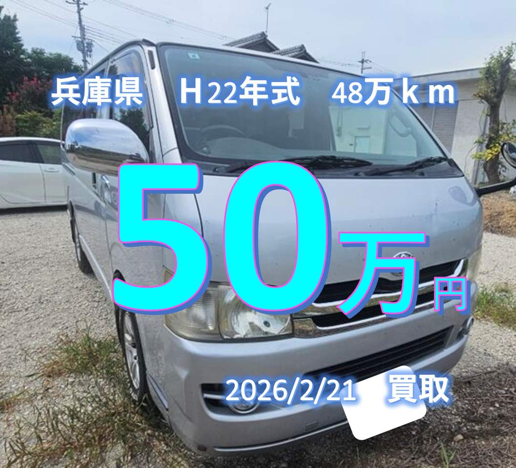 【買取事例】平成22年式ADF-KDH201V兵庫県 2026年3月24日 ツイート シェア はてブ 送る Pocket 車名 ハイエースバン 年式 平成22年03月 走行距離 km 型式 ADF-KDH201V グレード スーパーGL 都道府県 兵庫県 買取価格 500000円 類似のハイエース買取事例 【買取事例】平成22年式ADF-KDH201V愛知県 ハイエースの概算査定金額をお知りになりたい場合はこちらから お名前 (必須) 地域 (必須) 例:大阪府 吹田市 メールアドレス (必須) 車種名 (必須) 選択してください —以下から選択してください—ハイエースバンレジアスエースバンハイエースワゴンレジアス(or ハイエースレジアス)その他 グレード(バンの場合) (必須)選択してください グレード(バンの場合) (必須)選択してください —以下から選択してください—スーパーGLDXーGLパッケージDX グレード(ワゴンの場合) (必須)選択してください —以下から選択してください—グランドキャビンGLDXリビングサルーンEXスーパーカスタムリミテッドスーパーカスタム(G)カスタムその他不明 型式がわかりますか? (必須) 選択してください —以下から選択してください—分かる今は分からない 型式(必須) 燃料の種類(必須) —以下から選択してください—ガソリンディーゼル 駆動方式(必須) —以下から選択してください—2WD4WD 年式(初年度登録)(必須) 例:H8年 走行距離 (必須) 例:約19万km 車検期限 (必須) 例:H28年9月 トランスミッション(必須) 選択してください —以下から選択してください—オートママニュアル スライドドアについて(必須) —以下から選択してください—わからない両側スライドドア(5ドア)片側スライドドア(4ドア) 荷室のタイヤハウスについて(必須) —以下から選択してください—わからないタイヤハウス有タイヤハウス無し(ジャストロー) 車体色 (必須) 例:白 車の状態 その他 電話番号(メールが届かない場合があります。なるべく書いてください) 当社をお知りになったきっかけ(必須) 選択してください —以下から選択してください—店舗の看板ラジオCM知人の紹介以前弊社で車を売却したことがあるWEBサイト(Google検索)WEBサイト(Yahoo検索)Youtube(ショート)SNS(instagram)SNS(twitter)Tiktokその他 上記の内容で申し込む(必須) Δ