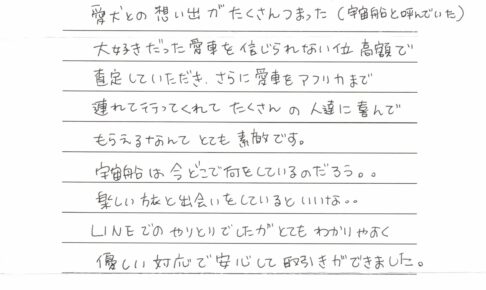 愛犬との想い出がたくさんつまった(宇宙船と呼んでいた)大好きだった愛車を信じられない位高額で査定していただき、さらに愛車をアフリカまで連れてってくれて、たくさんの人達に喜んでもらえるなんて、とても素敵です。 宇宙船は今ど…