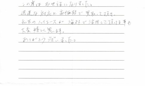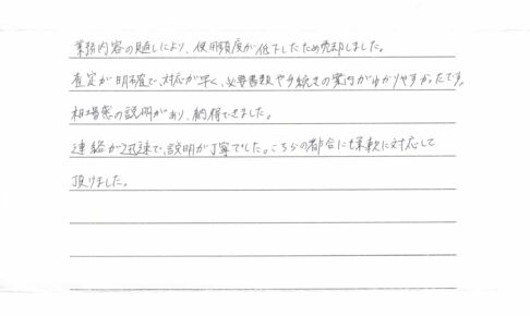 想像をはるかに上回る丁寧さ、スピード、手軽さでした。 面倒な手続きもなく臨機応変な対応を取って頂きありがとうございました。