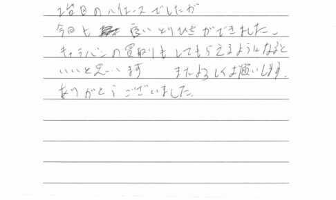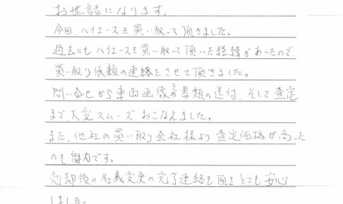 大好きで大切に乗ってきた車でした。 他の人から見たらボロボロと思われるようなハイエースでしたが想像以上の値段で買取りしていただきおどろきました。 次の所有者にも大切に乗ってもらいたです。ありがとうございました。 &nbs…